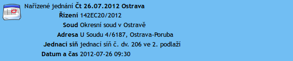 Pokud je v řízení nařízeno jednání, jste na něj upozorněni e-mailem s tzv. pozvánkou (typicky spolu s datovou zprávou od soudu s nařízením jednání), s možností vložit událost do Vašeho kalendáře v MS Outlooku, Kalendáři Google či jiném podporovaném kalendářovém programu.